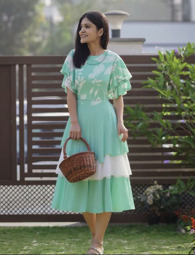 The Two-Layer Frock Model blends simplicity with charm, showcasing a soft outer layer over a fitted base for a graceful, modern silhouette. Ideal for those who love a subtle yet stylish appearance.